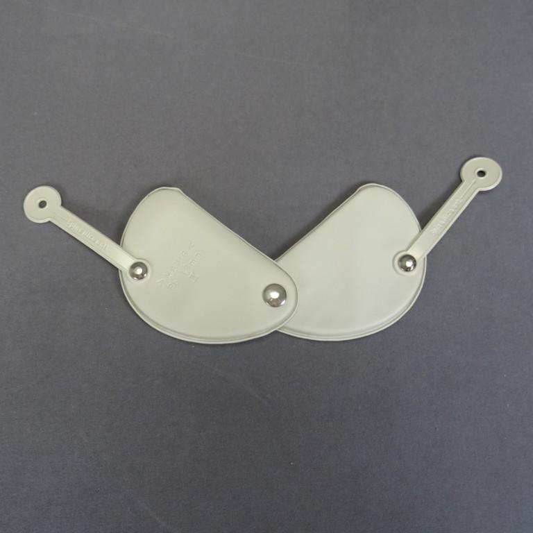 C’est un ensemble de deux demi-cercles en PVC de couleur grise recouvrant des plaques plombées. Ils sont reliés entre eux par un rivet permettant  de les écarter plus ou moins à l’aide de deux languettes situées latéralement, retenues par un rivet et terminées par un anneau troué.