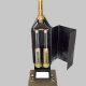 Cette balance de précision à deux simples plateaux est dans une cage en bois de hêtre à trois faces fixes vitrées et une façade fermée par une porte vitrée coulissant vers le haut, pouvant être levée grâce à une petite languette métallique. Sous cette porte, au centre, un bouton permet la libération des plateaux. A l’intérieur sur un plaque de bakélite noire est fixé le support du fléau qui comporte une règle noire graduée de 10 à 0 à 10. De ce fléau part une longue aiguille qui se positionne à la verticale en bas sur une plaque blanche graduée de 10,5,0,5,10. Sur la plaque, près de l’axe, est fixé un niveau à bulle. Sur le côté, un bouton devait orienter un tige métallique. A l’intérieur sont posés trois petits disques métalliques à positionner sous les deux pieds réglables et le pied fixe à l’arrière ainsi qu’une boîte en bois contenant sept poids de cuivre pour les g,et une boîte ronde noire contenant 19 lamelles de cuivre et d’aluminium pour les dg et cg.