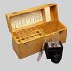 Le coffret de couleur noire comporte un couvercle s’articulant sur le fond par deux charnières et une fermeture à clip. Le dessus du couvercle porte l’inscription :  » HEMOGLOBINOMETRE ET Préciss-Paris « . L’intérieur du coffret est tapissé de feutrine de couleur marron et est divisé en trois compartiments. Le contenu du coffret comporte trois éléments :