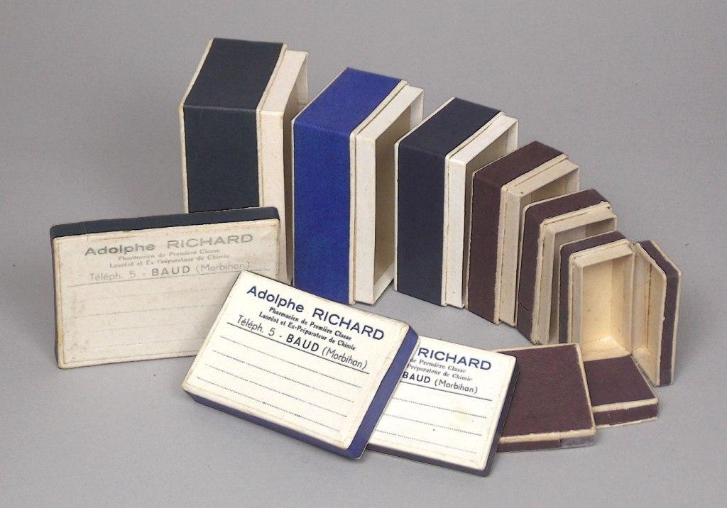 Un lot de six boîtes rectangulaires gigognes, dont les trois plus grandes sont étiquetées Adolphe Richard Pharmacien de Première Classe Lauréat et Ex-Préparateur de Chimie Téléph.5 Baud Morbihan. Couleur noire, bleue ou marron. Un sachet de poudre blanche dans la plus petite.