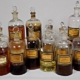 Bonbonnes de verre entourées de bois et protégées par de la paille ou des copeaux de bois. Deux récipients de 5 litres, un récipient de 35 litres, deux récipients de 50 litres.