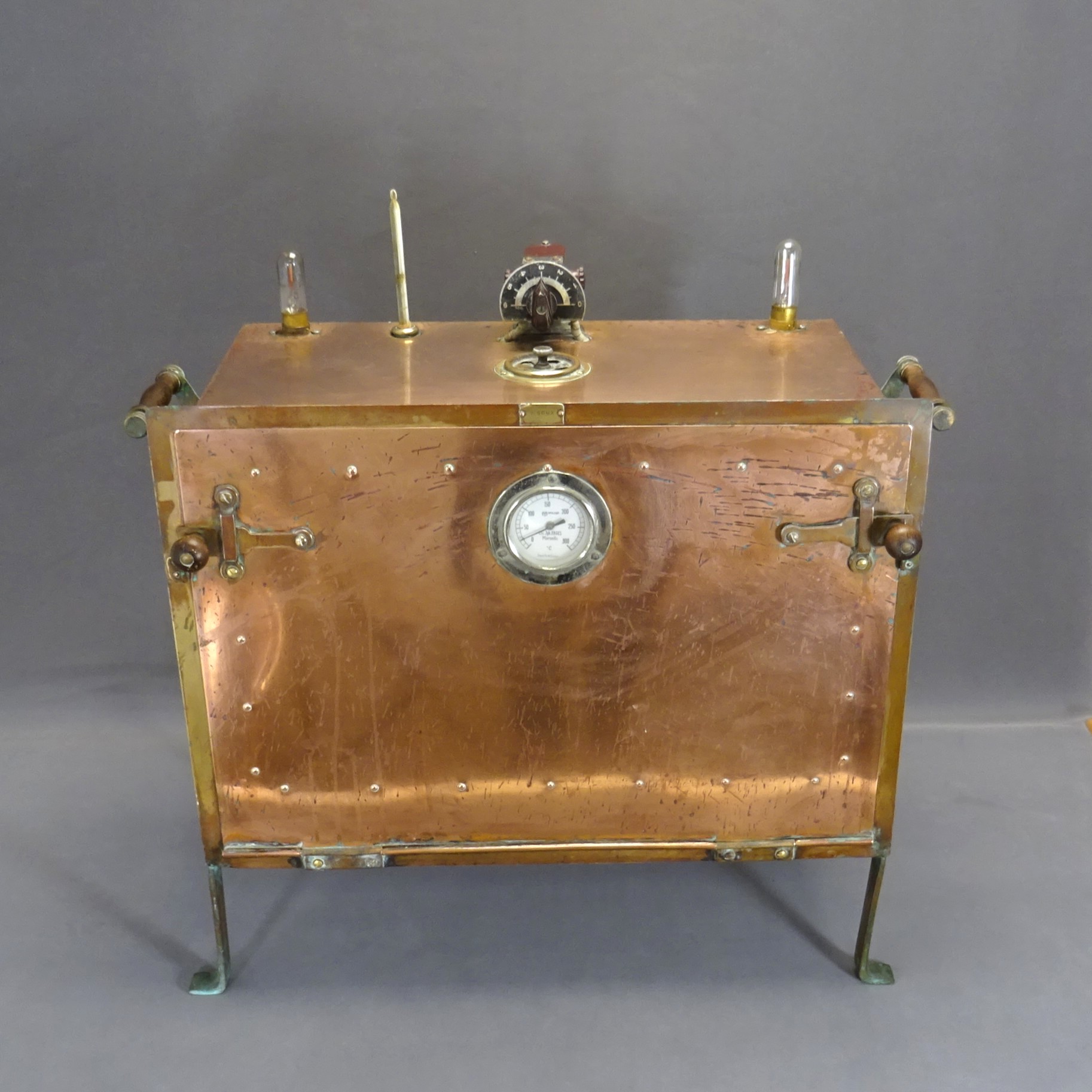 L’étuve Poupinel est une caisse en cuivre à double paroi entre laquelle circule de l’air chaud. C’est un coffre avec porte en façade et commande électrique sur la partie latérale droite.