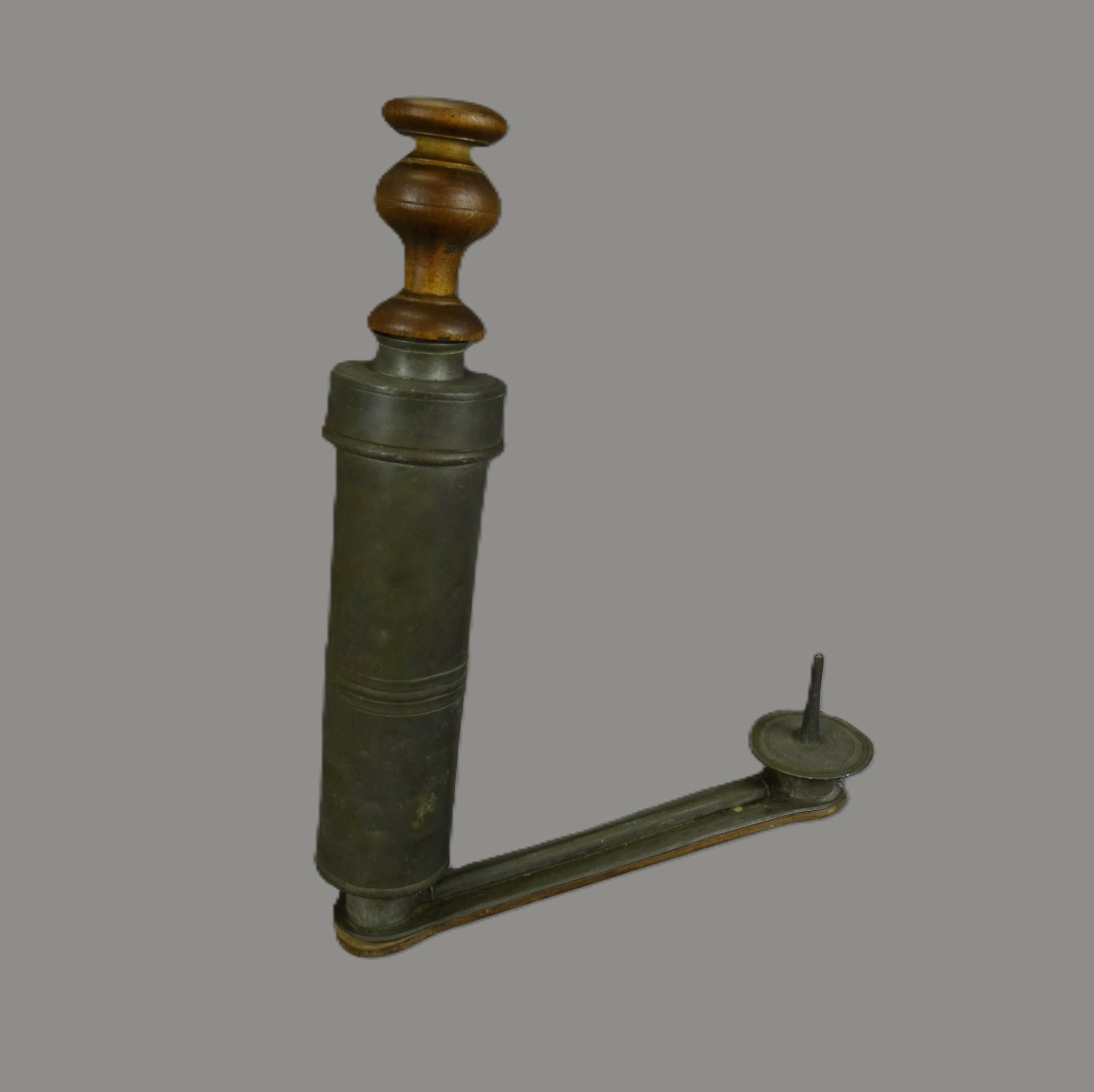 C’est un instrument qui se compose : d’un réservoir vertical, de type seringue, en métal. A une extrémité, il est fermé par un couvercle vissé dans lequel se loge un piston en bois tourné, à la poignée arrondie. A l’autre extrémité, ce réservoir est vissé sur un socle plat rectangulaire, arrondi aux deux bouts, fait de métal et de bois. Sur ce socle court un tuyau, issu du réservoir, qui se termine par une canule, recourbée vers le haut, en forme d’obus effilé et fixée sur un petit plateau arrondi.
