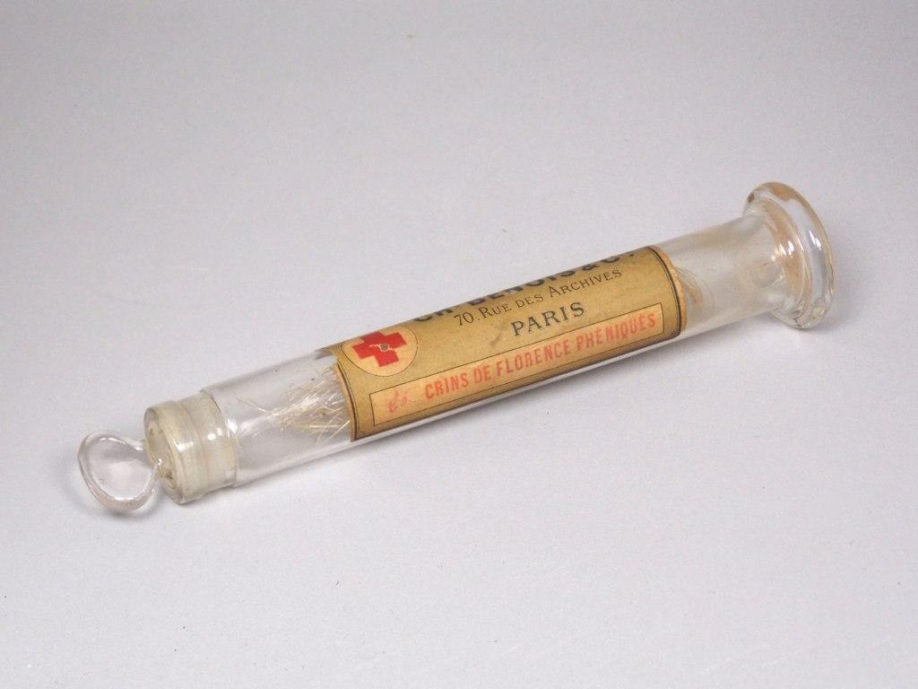 Flacon de verre fermé au bouchon émeri, contenant un faisceau de crins