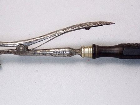 Manche d’ébène prolongé par un axe principal sur lequel vient s’articuler un bras réglable actionné par pression. Ces deux bras se terminent en forme de crochets pointus. Une tige filetée permet un écartement précis.