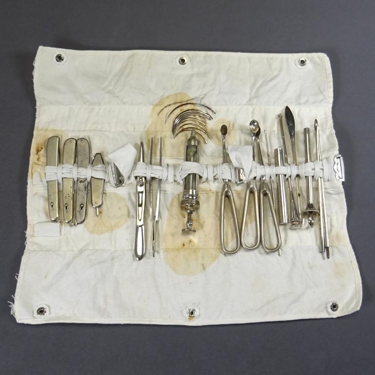 Destination Cette trousse, contenant un nécessaire de petite chirurgie, était utilisée pour pratiquer les premiers soins aux blessés sur les champs de bataille avant leur évacuation. Elle permettait au chirurgien d'extraire des balles ou des fragments d'obus, de nettoyer les plaies et de les suturer. |