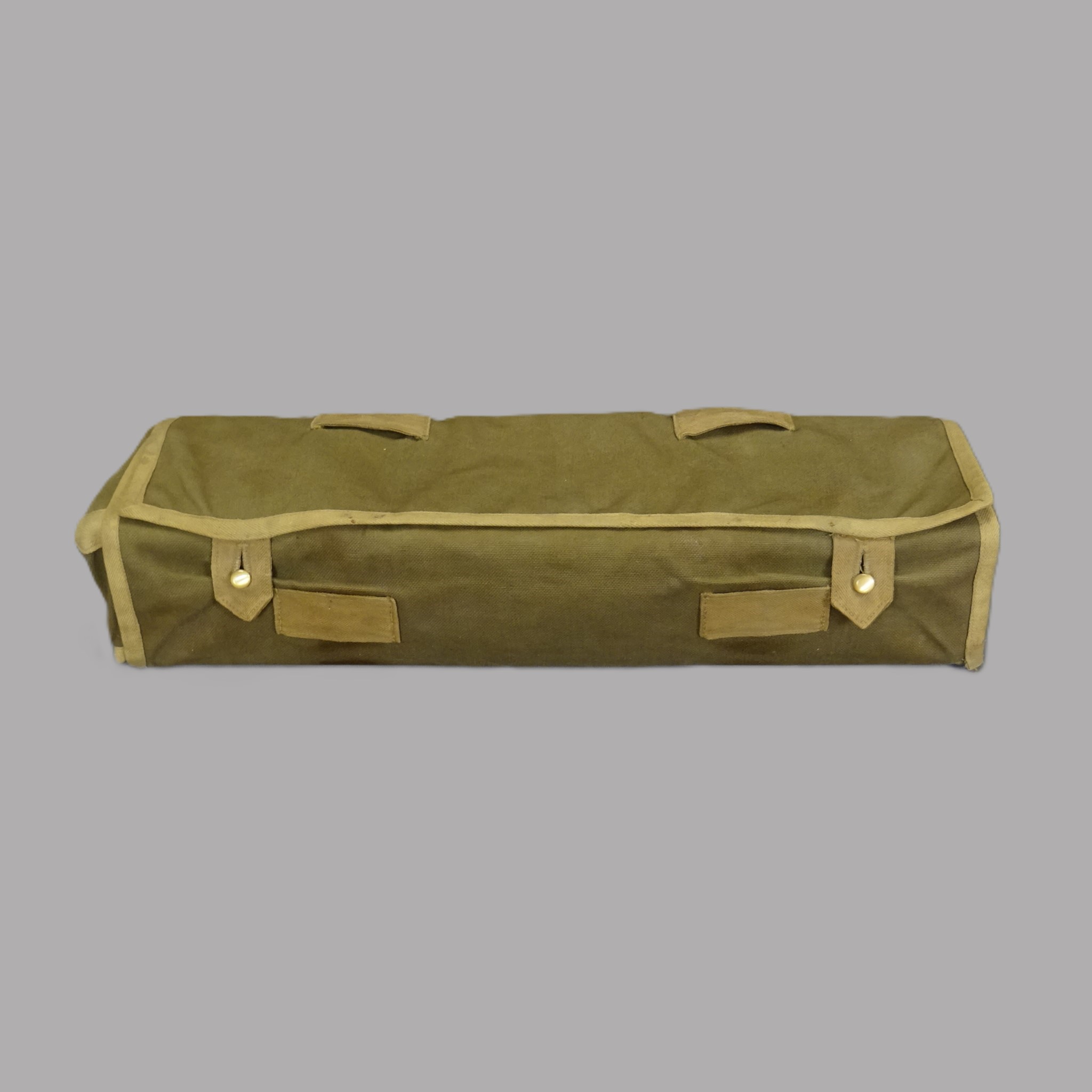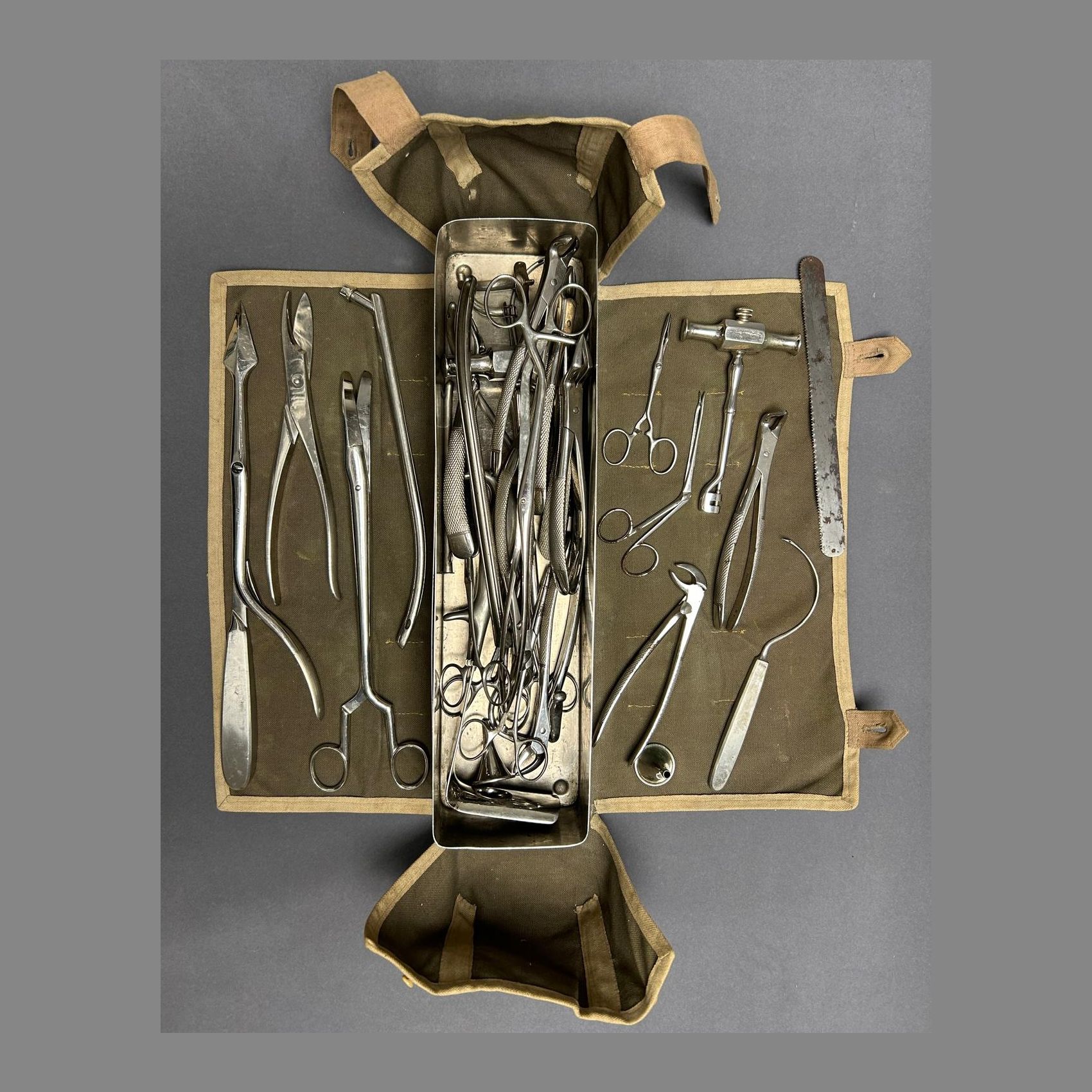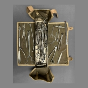 Cette trousse est composée d’une boite en acier inoxydable comprenant divers instruments de chirurgie. Une sacoche en forte toile de couleur kaki munie d’attaches l’enveloppe.