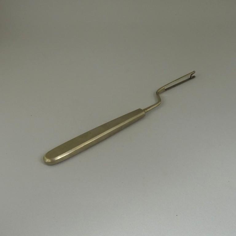 Cet instrument présente un manche à baïonnette prolongé d’une tige qui se termine en forme d’étrier sur lequel est adapté  un couteau pivotant à 360° à double pente.