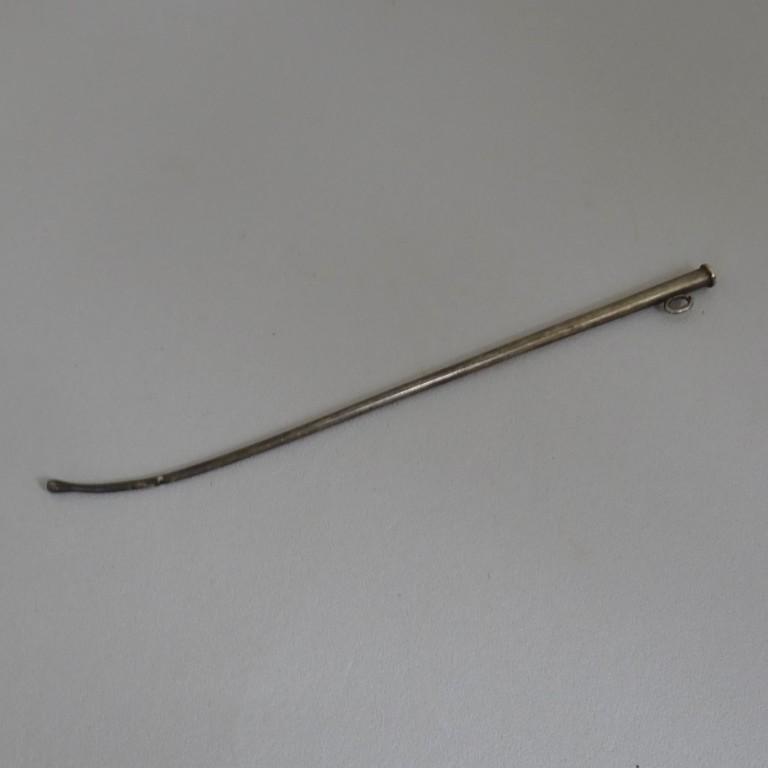 Cet objet de présente sous la forme d’un petit tube creux dont l’extrémité affinée et légèrement courbée se termine par une olive percée. A l’autre extrémité se trouve un petit anneau.