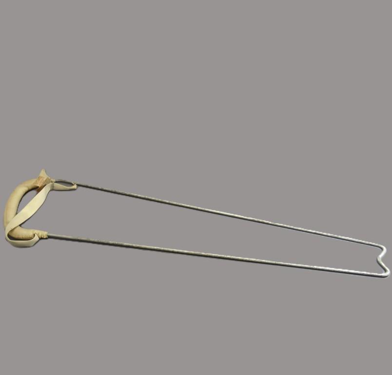Equipement  constitué de deux tiges métalliques de longueur légèrement inégale formant un cadre, réunies à leur partie inférieure par une barre transversale en forme d’accent circonflexe. La partie supérieure de ce cadre comporte  en arrière, un demi-anneau métallique recouvert de cuir, sorte de coussinet en forme de boudin, et en avant, une sangle en toile, étiquetée  « ARMY LEG SPLINTS » et réglable grâce à des anneaux métalliques de serrage.