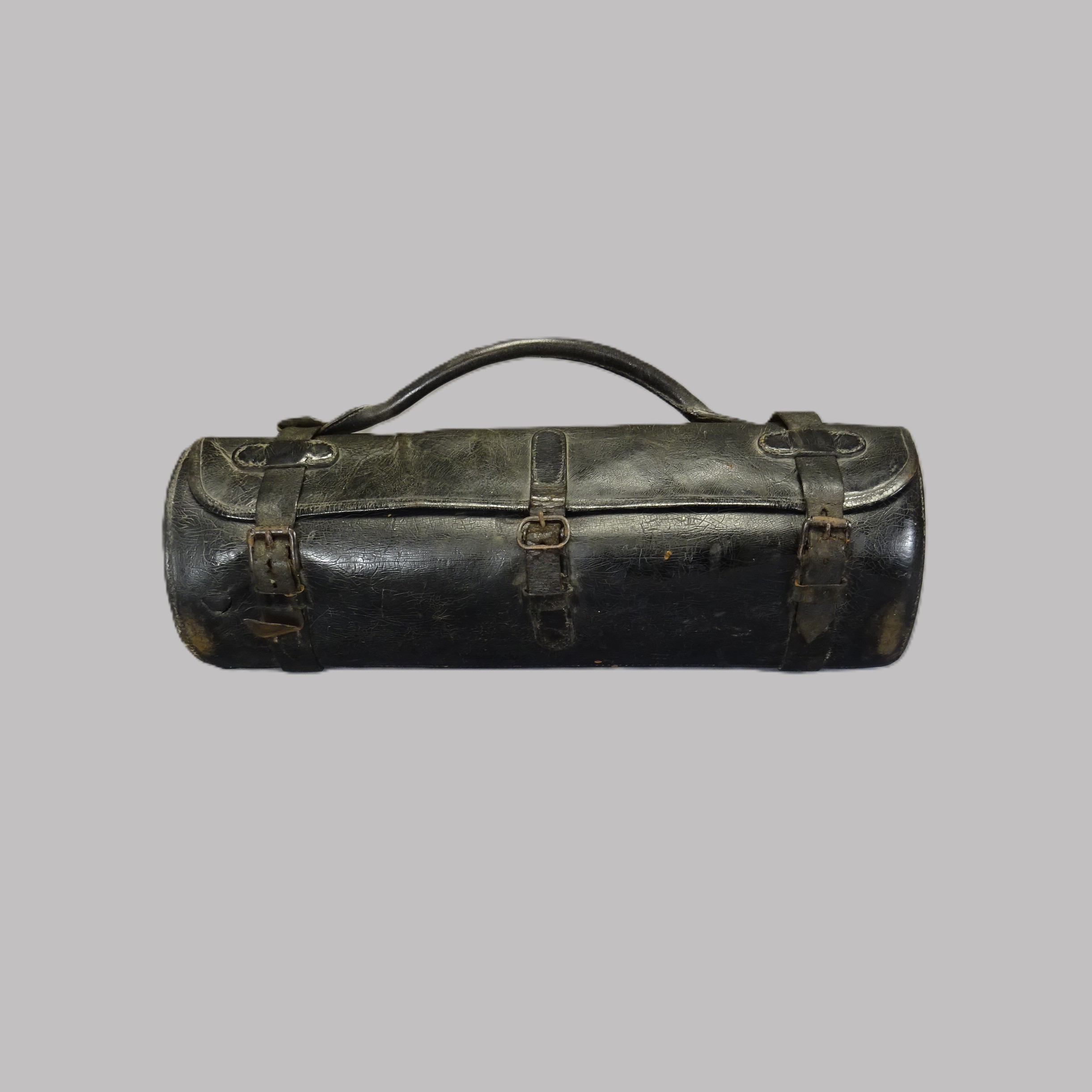C’est un objet en cuir noir épais, rigide, de forme cylindrique à un seul compartiment. Le couvercle se ferme avec trois sangles d’inégales longueurs qui se terminent par une boucle, type ceinture. Celles aux deux extrémités font le tour de la mallette et sont fixées par trois passants. La sangle du milieu est plus courte et n’a qu’un seul passant. Une poignée, de forme arrondie au centre, aplatie aux extrémités coulisse sur les deux grandes sangles. Cette mallette contient deux forceps, un spéculum, un perforateur et une seringue avec aiguille dans une boîte en fer.