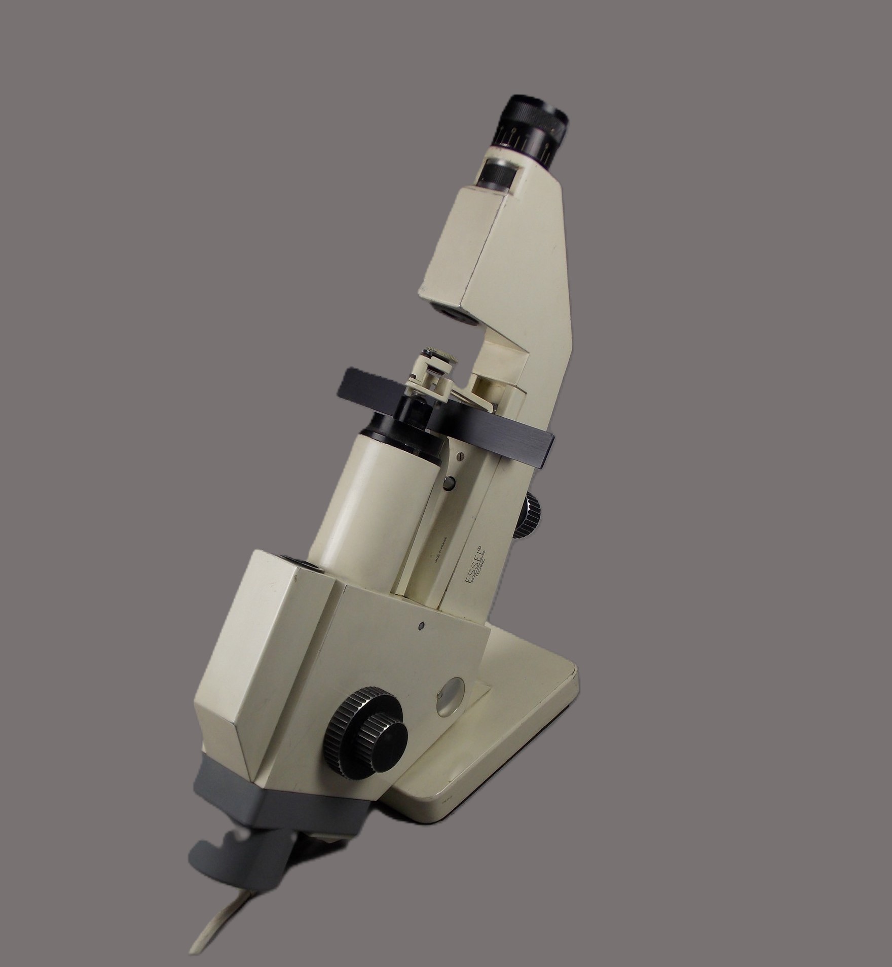 Cet appareil a été fabriqué dans les années 1970 par Essilor Instruments, division de la société Essilor chargée de la fabrication d’instruments d’optique (principalement les appareils de taillage de verres finis et ceux de dépistage des défauts visuels). Essilor est née en 1972 de la fusion de la Société des Lunetiers, apparue en 1849 et qui a pris en 1964 la raison commerciale Essel, et de la société Silor. Cette dernière est issue d’un groupe dont l’histoire débute en 1919 avec l’ouverture par Georges Lissac (1897-1969) et deux de ses frères d’un premier magasin d’optique à Paris, rue Dauphine. L’affaire se développant sont créées successivement la S.A.R.L. Les Frères Lissac en 1931, la Société industrielle de Lunetterie en 1946, dédiée à la fabrication des montures de lunettes, et la société des Lentilles ophtalmiques spéciales (L.O.S.) en 1948. La L.O.S. devient L.O.R. (Lentilles ophtalmiques rationnelles) en 1960 puis les différentes sociétés sont regroupées en 1968 au sein du groupe Silor (Société industrielle de Lunetterie et d’Optique rationnelle). Principalement utilisé par les sections de techniciens supérieurs en Optique lunetterie (BTS OL), ce frontofocomètre sert aussi à celles d’Instruments d’Optique et de Précision (BTS IOP) et aux élèves du baccalauréat technologique F 10 Optique (actuellement Sciences et Techniques industrielles option Optique).