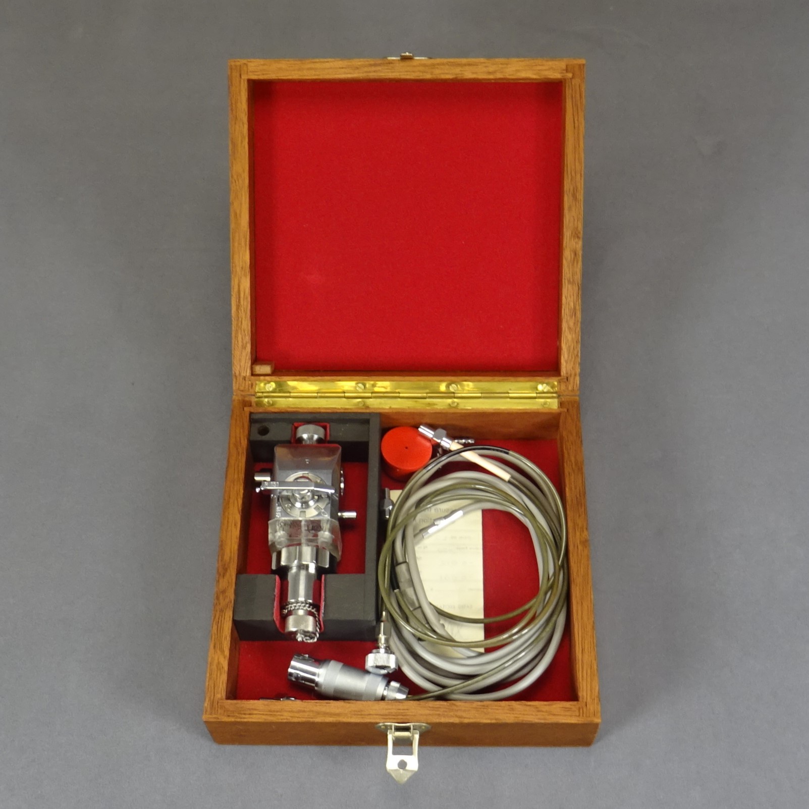 Le coffret contient un mode d’utilisation rédigé en anglais, un récépissé d’étalonnage réalisé le 30/04/1970, deux tubulures portant chacune une extrémité mâle et une extrémité femelle, un câble électrique avec une extrémité composée d’une prise à quatre fiches femelles disposées en carré, et une autre prise à  quatre prises femelles disposées en arc-de-cercle (branchement moniteur).