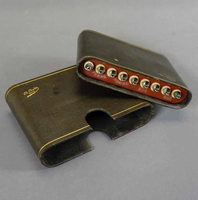 L’appareil se présente dans un boitier marron renfermant une batterie de piles sèches combinées à une série de fiches. Sur le couvercle de même couleur est noté en lettres dorées: « Ch. Chardin Paris ».