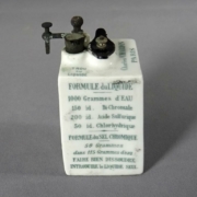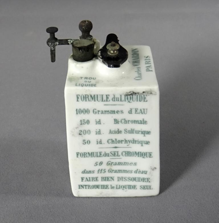 À gauche de la bobine est insérée une pile carbone-zinc, plongée dans une solution d’acide sulfurique et de bichromate de potasse. Cette pile a la particularité d’être enrobée de porcelaine blanche comportant sur sa partie supérieure trois orifices : l’orifice central sert à positionner l’électrode en carbone, solidement retenue par un bouchon ; deux autres orifices permettent, l’un, d’introduire l’électrode en zinc dans l’électrolyte, l’autre de la conserver au sec en période de non utilisation. Cet orifice correspond à un logement cylindrique qui ne communique pas avec le reste du récipient.