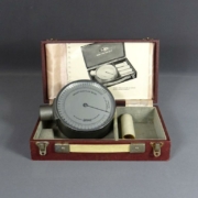 Cet appareil est présenté dans une valisette en bois recouverte d’un tissu rouge lie-de-vin, compartimentée et tendue d’un tissu gris. Le couvercle est tendu de tissu satiné beige où apparait : Airmed – Wright Peak Flow Meter.
